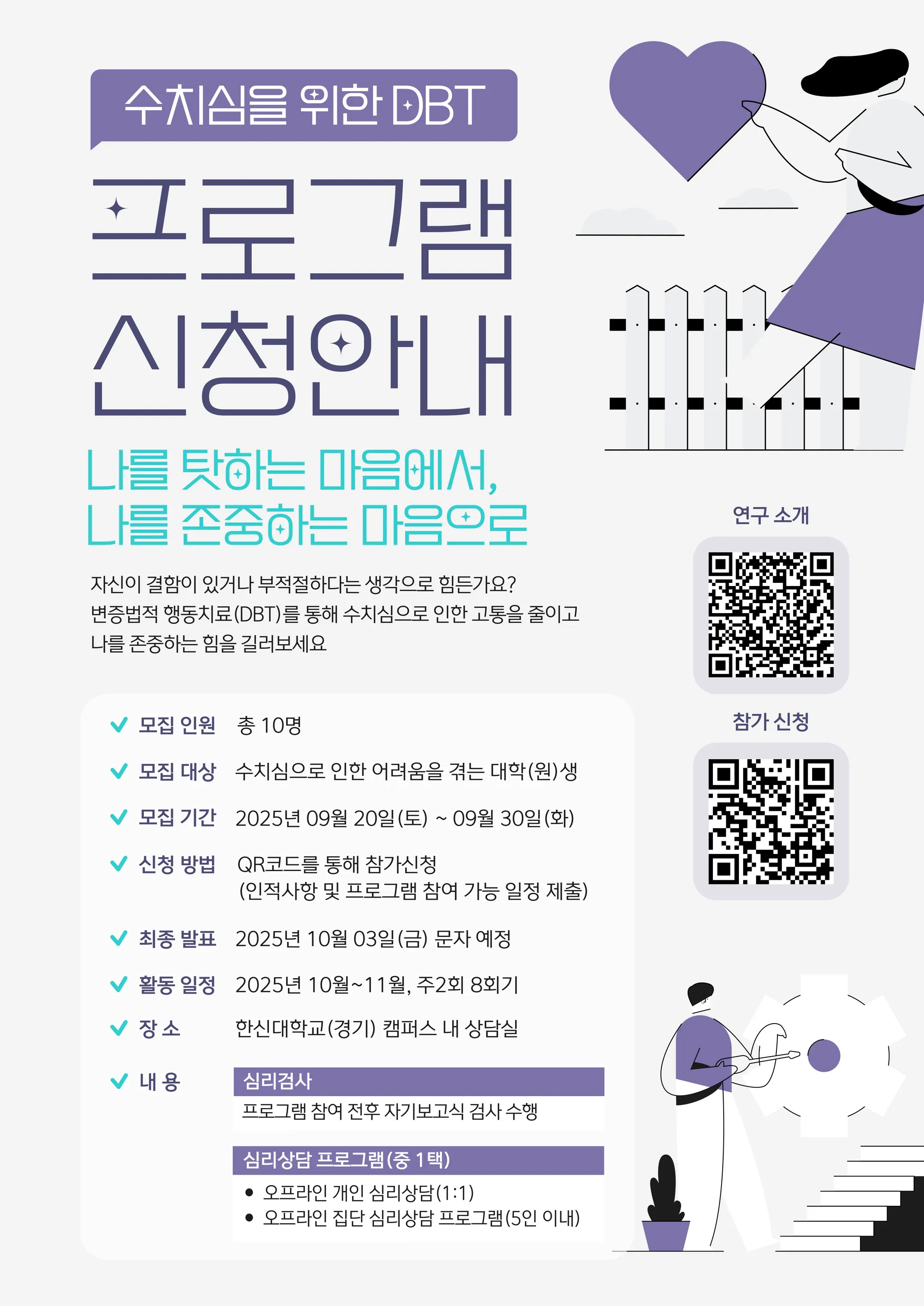 한신대학교 일반대학원(경기) 심리학과 정서장애의 이해와 치료 수업을 수강하는 석박사 과정생들이 연구 목적으로 수행합니다.
